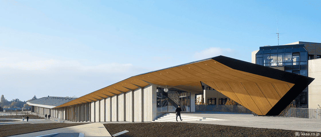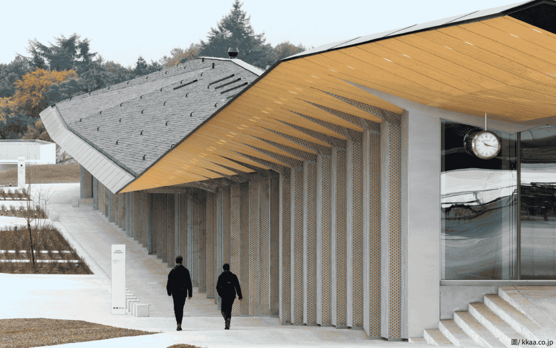日本建築師隈研吾也不遑多讓,在洛桑聯邦理工大學校園內設計了另外一座藝術實驗室「Art Lab」,靈感來自於日本摺紙藝術,根據光影形成不同程度的彎曲,這座單層狹長型建築,像是一條帶屋簷的走廊。